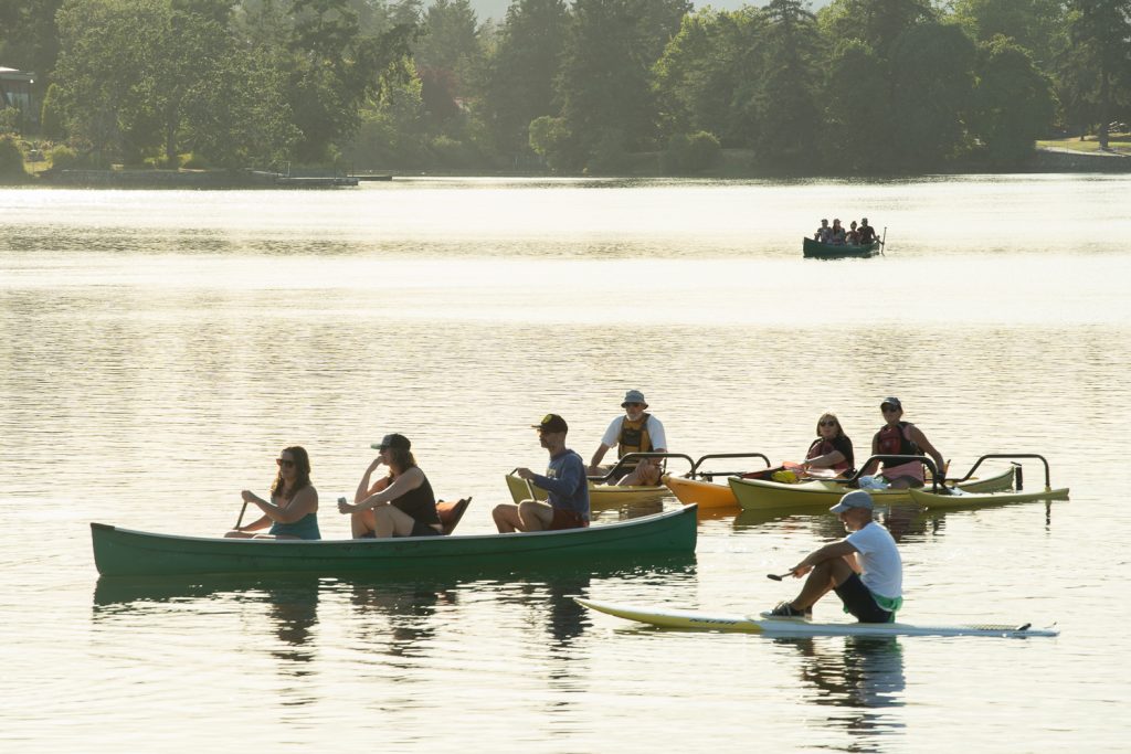Last night, at the first in RAVEN’s ‘Festival Afloat” concert series on Victoria’s Gorge waterway, we heard the Songhees story of Camossung and how the rocks in the the tidal inlet at the narrows were formed by Hayls, the creator, and how camas came to be the staple food of the Songhees people from knowledge keeper Brianna Dick, whose artwork also graced the show’s posters.