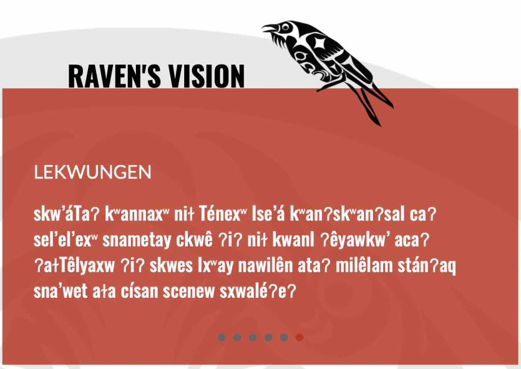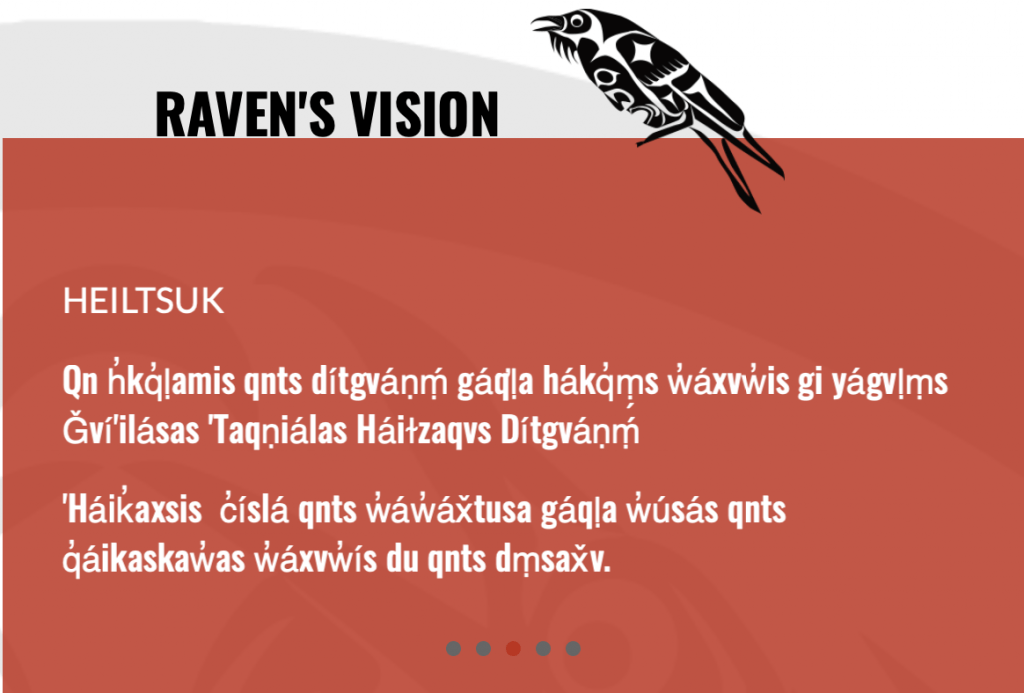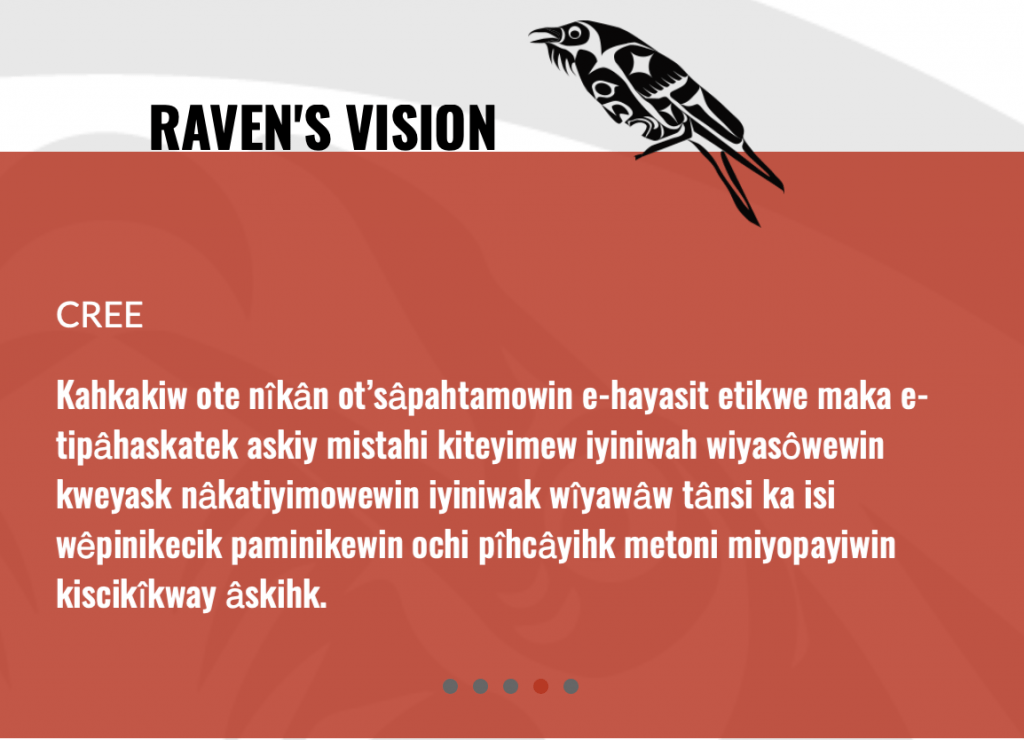 That’s what RAVEN set out to discover when we reached out to knowledge keepers of Heiltsuk, Cree, Wet’suwet’en, Secwepemc, Lekwungen, Esquimalt and Tsilhqot’in Nations to translate our official mission statement into Indigenous languages.