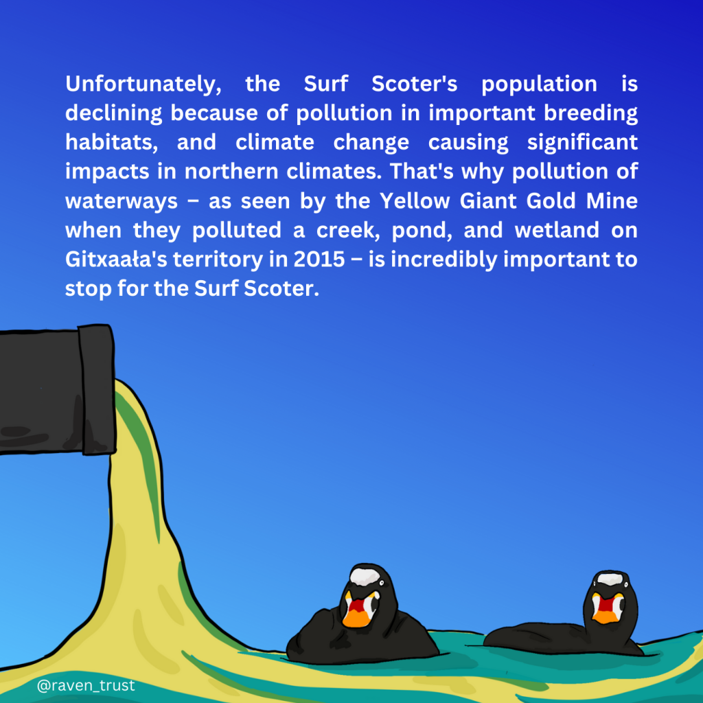 The Surf Scoter is a sea duck who stops by Gitxaała’s territory on its way to the Arctic to mate. The Surf Scoter is an important part of the ecosystem, providing balance by eating marine snails, small crabs, herring spawn, and mollusks that would otherwise overtake the ecosystem. The Surf Scoter’s habitat needs are very specific, and their population in Gitxaała’s territory is in decline due to pollution and climate change. That’s why pollution of waterways – as seen by the Yellow Giant Gold Mine when they polluted a creek, pond, and wetland on Gitxaała’s territory in 2015 – is incredibly important to stop.