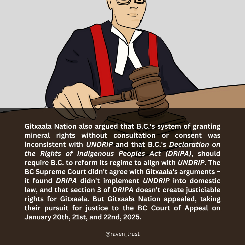 In B.C.’s written arguments submitted to the court, they stated “Canada—and within it, B.C.—has emerged as a world leader in UNDRIP implementation.” But, how can B.C. be a leader for implementing UNDRIP when they are arguing against Gitxaała Nation in court today? B.C. needs to be held accountable, not just by Indigenous Nations and the general public – they need to be held accountable to DRIPA under law.