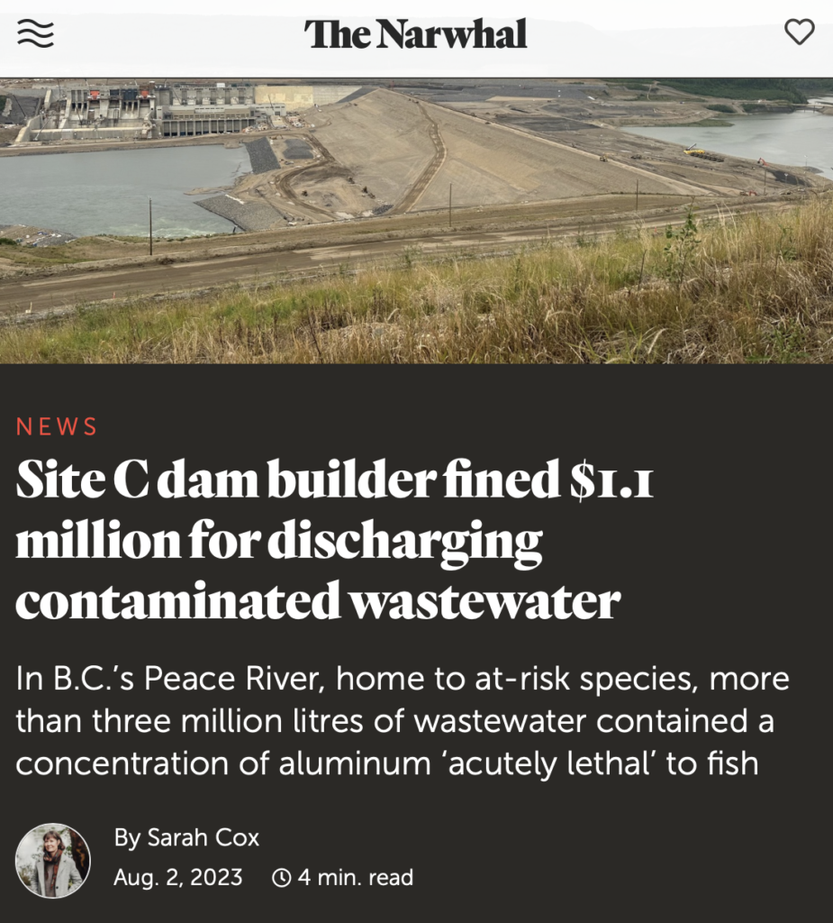 The contractor building the Site C hydro dam in northeast B.C.’s was fined $1.1 million this week after pleading guilty to discharging more than three million litres of contaminated wastewater into the fish-bearing Peace River. Read more from The Narwhal here.