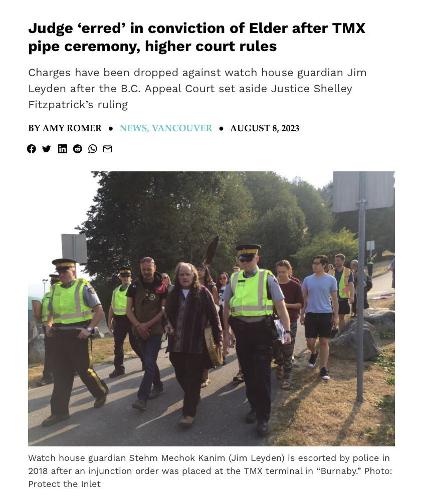 A B.C. Supreme Court judge made an error when she convicted an Elder after he held a pipe ceremony outside of a Trans Mountain terminal, according to a ruling from the province’s highest court. Read more from Indiginews here.