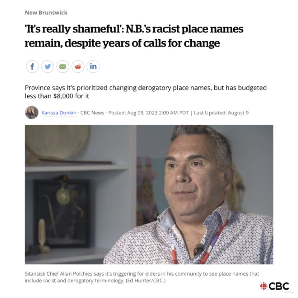 New Brunswick Province it’s prioritized changing derogatory place names, but has budgeted less than $8,000 for it. Read more from CBC here.